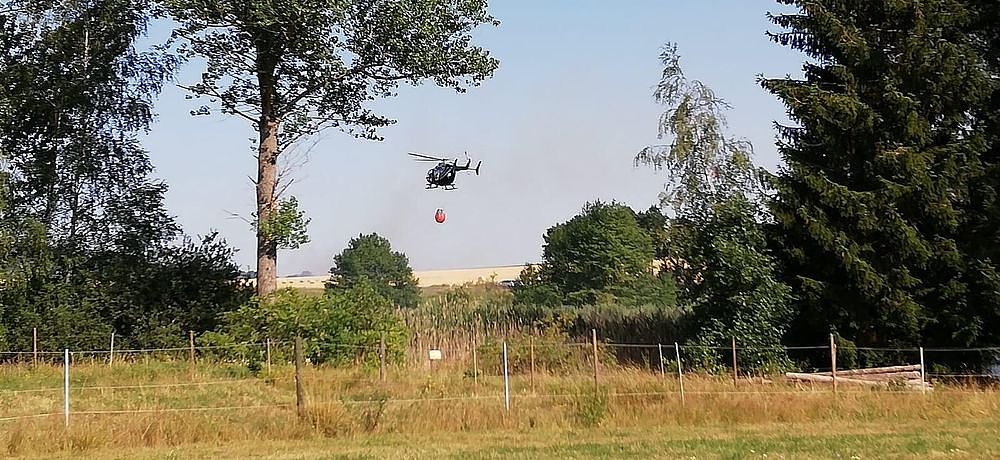 Die Einsatzleitung forderte zur Unterstützung den Polizeihubschrauber als Löschhubschrauber an. Die Bilder zeigen eine Aufnahme aus der Luft und zum anderen den Heli beim "Wasser tanken".