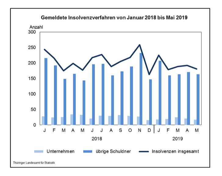 Die Thüringer Amtsgerichte entschieden von Januar bis Mai 2019 über 966 Insolvenzverfahren. Das waren nach Mitteilung des Thüringer Landesamtes für Statistik insgesamt 45 Anträge weniger als im Vorjahreszeitraum (-4,5 Prozent).