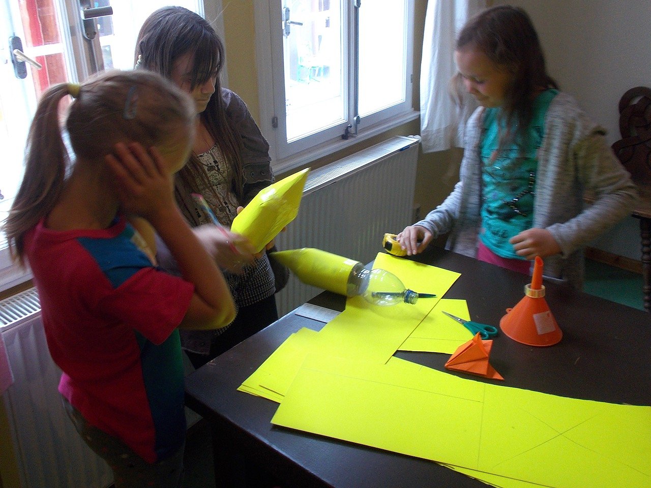 Dann wird mittels einer großen Fahrradluftpumpe der Druck in der Flasche so sehr erhöht bis die Rakete beschleunigt und mit großem Spaß, unter Wasserströmen senkrecht in den Sommerhimmel aufsteigt. Natürlich benötigen die Raketen auch Leitwerk und Spitze die vorher unter sachkundiger Anleitung der KILA-Mitarbeiter angebracht werden. Anschließend werden die Flugkörper noch farblich gestaltet. Am Ende darf jeder Kosmonaut seine persönliche Rakete mit nach Hause nehmen.