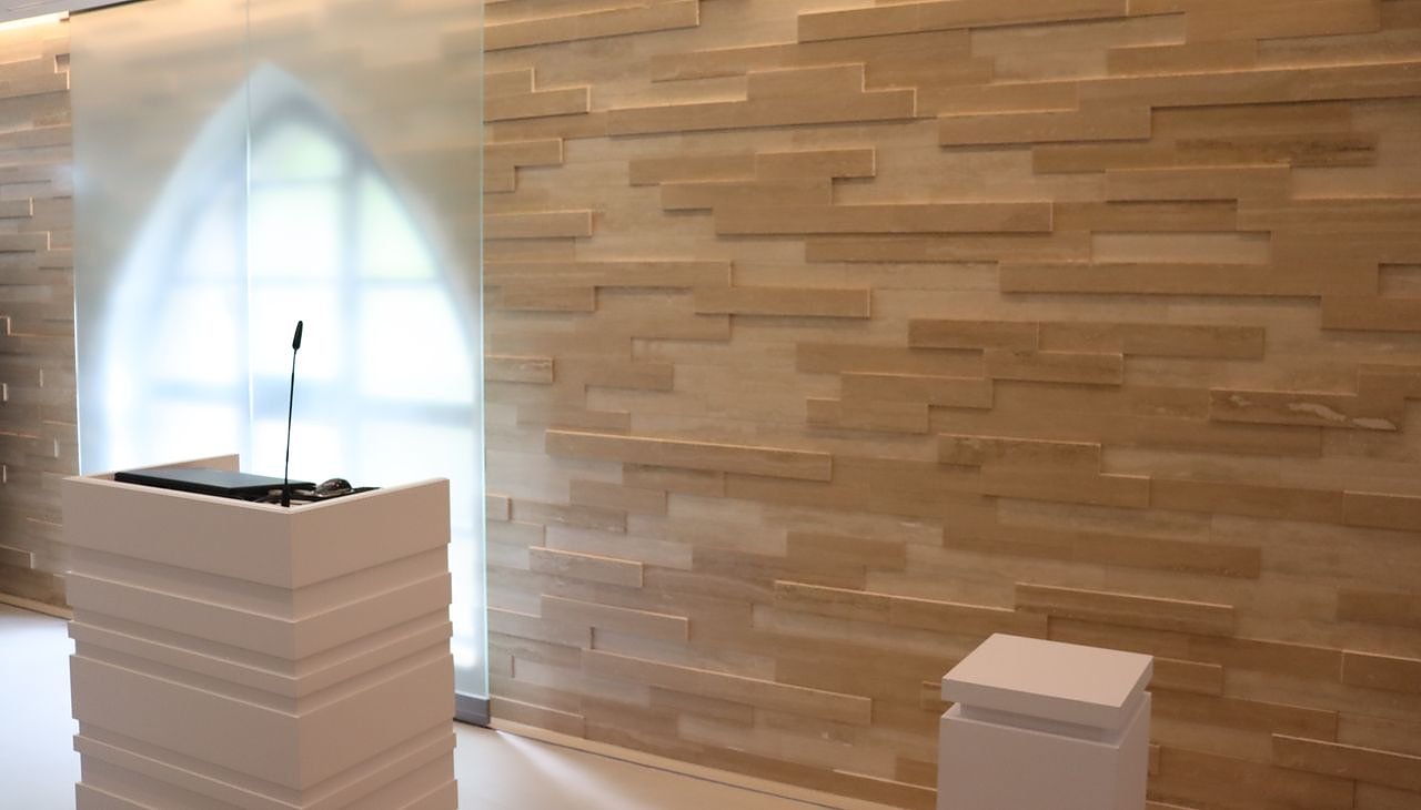 Je nach Bestuhlungsvariante können 30 bis 40 Trauergäste Platz finden. Das Design des neuen Trauerraums, mit architektonischen Elementen an den Wänden aus hellem Natursteinversatz unter Einbeziehung des natürlichen Lichts des Panoramafensters, lassen die Räumlichkeit in einem angenehmen Licht erstrahlen und schaffen so eine besondere Atmosphäre. Darüber hinaus erhielt die Trauerhalle eine moderne Beschallungsanlage und die Möglichkeit der Projektion von Fotos und Videos in Kombination mit musikalischer Untermalung. Die Be- und Entlüftung des Raumes mit Klimafunktion sorgt für ein angenehmes Raumempfinden.