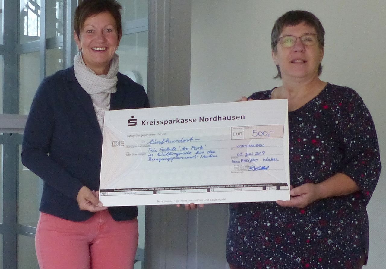 Silke Külbel bei der Scheckübergabe an Gisela MorgenrothZiel war es, mit dem Bau eines Bewegungsparcours die Kinder/Jugendlichen sowie die Mitarbeiter des Heilpädagogischen Zentrums anzusprechen. Sportliche Aktivitäten stärken Knochen und Muskulatur, Herz-, Kreislauf- und Stoffwechselerkrankungen werden vorgebeugt sowie das Immunsystem wird gestärkt. Nur einige Gründe, warum Mitarbeiter und Kinder ihre Pausen clever nutzen sollten.
