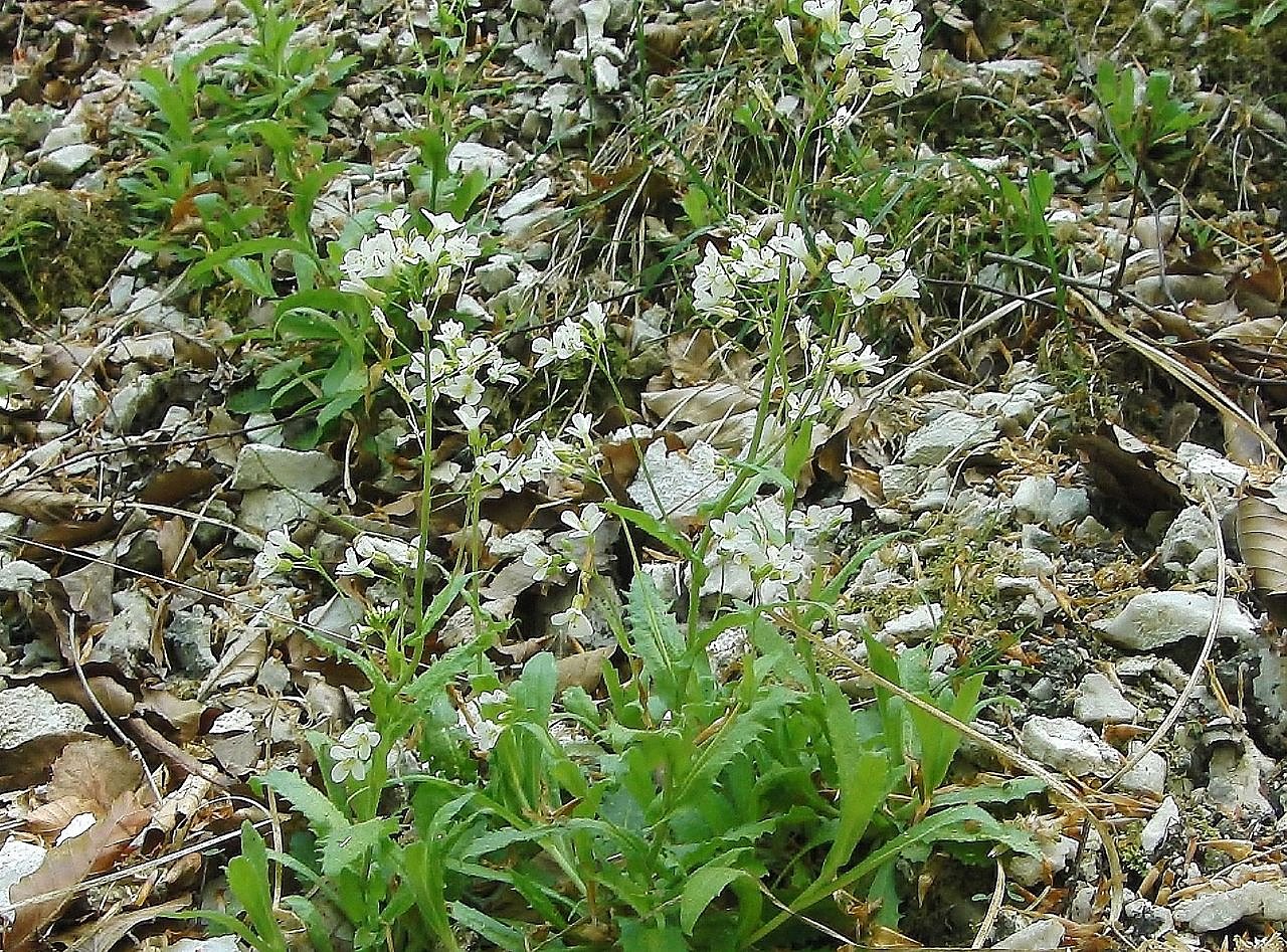 Hier war die Welt für die Alpen-Gänsekresse wenigstens noch ein bisschen in Ordnung: Keine Pilzinfektion und keine ewige Dürre setzten dem arktisch-alpin verbreiteten Relikt an ihrem nach Vernichtung durch den Gipsabbau besiedelten Ersatzswuchsort zu. Aufnahme eines Exemplares vom 01.05.2011