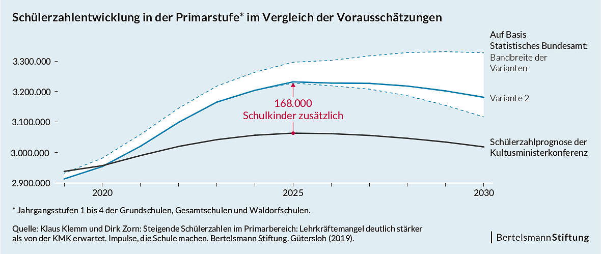 Diese Diskrepanz ist auf einen stärkeren Anstieg der Schülerzahlen zurückzuführen. Ging die KMK im vergangenen Jahr noch davon aus, dass die Zahl der Schülerinnen und Schüler in der Primarstufe im Jahr 2025 bei 3,064 Millionen liegen würde, zeigt eine Schülerzahlenprognose auf der Basis der aktuellen Bevölkerungsvorausschätzung des Statistischen Bundesamts, dass die Zahl der Grundschulkinder rund 3,232 Millionen betragen dürfte. Dies entspricht einem Plus gegenüber der KMK-Schätzung von rund 168.000 Schülern.