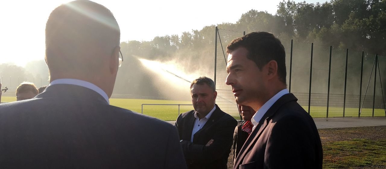 Erste Station dieser kurzen Stippvisite des Mike Mohring war der Albert-Kuntz-Sportpark. Hier stellten der Landrat und Service-Geschäftsführer Gunnar Reuter, gemeinsam mit Wacker-Präsidiumsmitglied Hans-Joachim Junker nicht nur die Geschichte, sondern vor allem die Zukunft des sportlichen Areals vor. "Ende der 1980er Jahre wurde der AKS im damaligen Bezirk Erfurt zur schönsten Sportstätte erklärt", berichtete Junker und Jendricke ergänzt, dass es unzumutbar sei, dass sich die Stadt seit dem nicht um die Weiterentwicklung des Areal gekümmert habe. Sicher, ein Kunstrasenplatz ("habe ich errichtet") und Trainingsplatz kamen hinzu, doch das Stadion selbst habe außer einer beauflagten Flutlichtanlage und Wellenbrecher keine Modernisierung erhalten. "Was wir unseren Gästen bieten können, sind moderne Dixi-Klos."
