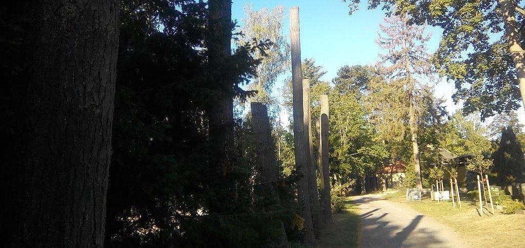 Auch sechs einst stattliche Kiefern fielen auf dem Hauptfriedhof Dürre und Trockenheit zum Opfer. Die große Fichte im Hintergrund liegt auch schon im Sterben.Um das zu erfahren, reiche ein kurzer Anruf bei der Friedhofsverwaltung, kam es mir in den Sinn. Doch Chefin L. war in Urlaub. Eine freundliche Mitarbeiterin erklärte sich aber bereit, sich beim Meister W. zu erkundigen. Das tat sie auch. Dafür ein Dankeschön. Der Erfolg blieb ihr jedoch verwehrt. W. könne, ließ sie wissen, aus Datenschutzgründen keine Auskunft darüber geben, wie viele Bäume trocken stünden. Staatsgeheimnis?