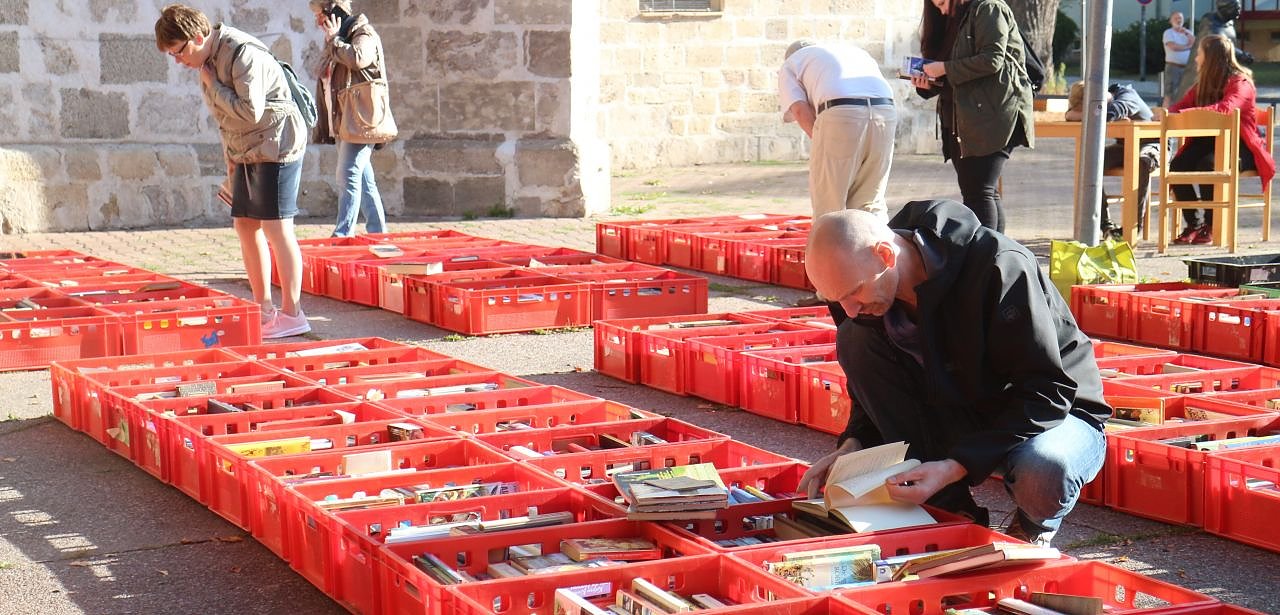 Weltbestseller, Kitschromane, Bildbände, Kochbücher, Klassiker oder alte Sowjet-Literatur - auf dem Blasiikirchplatz findet zur Stunde der zweite Bücherflohmarkt des Jahres statt. Erstes Ziel: möglichst viele Bücher vor der Tonne retten. Damit das klappt, wird das gedruckte Wort vom Kinderkirchenladen heute extra günstig abgegeben...