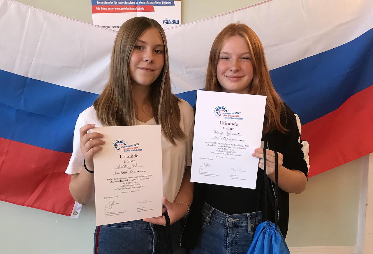 Svenja Schmidt und Charlotte Post vom Humboldt-Gymnasium Nordhausen haben den Heimsieg geholt und die Regionalrunde des Bundescups Spielend Russisch lernen” in Nordhausen gewonnen. Die beiden 15-jährigen Gymnasiastinnen setzten sich mit Vokabelkenntnis und Nervenstärke gegen dreizehn Teams aus Thüringen, Hessen und Niedersachsen durch.