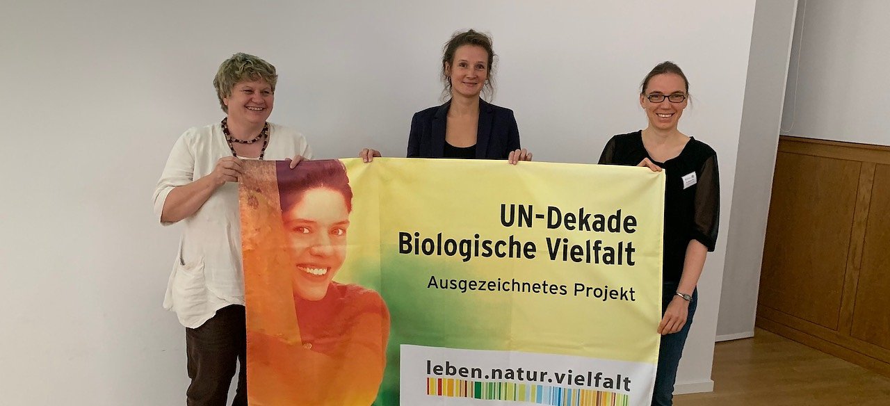 Autor: redGeschäftsführerin Astrid Koschorrek, Eva Finkerbusch vom Bundesamt für Naturschutz und Projektleiterin Dr. Kathleen Prinz mit dem ehrenden Banner