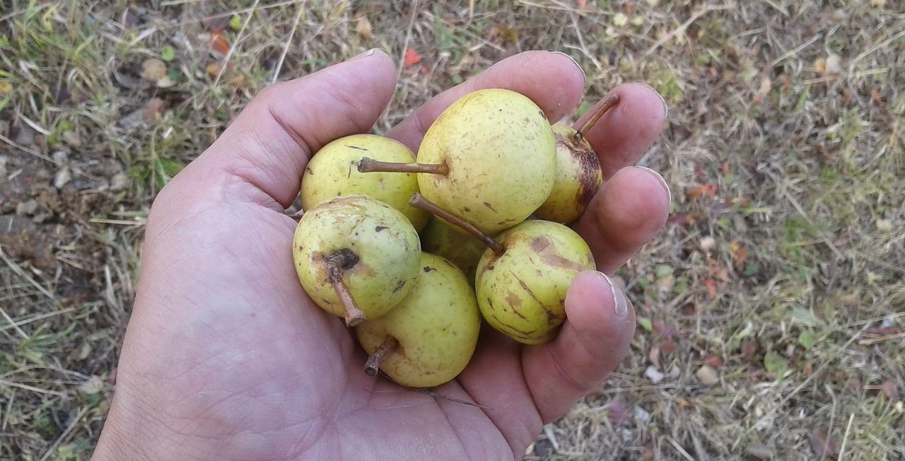 Die Wildbirnen-Früchte (Pyrus pyraster) sind so klein, dass mehrere von ihnen auf eine Hand passen. Manchmal sehen sie fast wie Äpfel aus. Der Erhaltung des heimischen Wildobstes sollte mehr Aufmerksamkeit gewidmet werden, zumal gerade die Wild-Birne Trockenheit und Wärme gut verträgt. Einer Untersuchung zufolge gibt es nur noch 14.000 Wild-Birnenbäume in Deutschland. Ein Hinweis auf eine Original-Wildbirne liefert die Unterseite der Früchte: Denn die einstigen Kelchblätter fallen nicht, wie bei der Kulturbirne ab, sondern bleiben, wenn auch vertrocknet, meist in voller Länge erhalten.