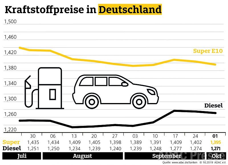 Teuerster Tanktag für beide Sorten war der 18. September. Autofahrer mussten für einen Liter Super E10 an diesem Tag durchschnittlich 1,426 Euro und für einen Liter Diesel 1,292 Euro bezahlen. Am günstigsten war Super E10 (1,379 Euro) bzw. Diesel (1,232 Euro) am 5. September.
