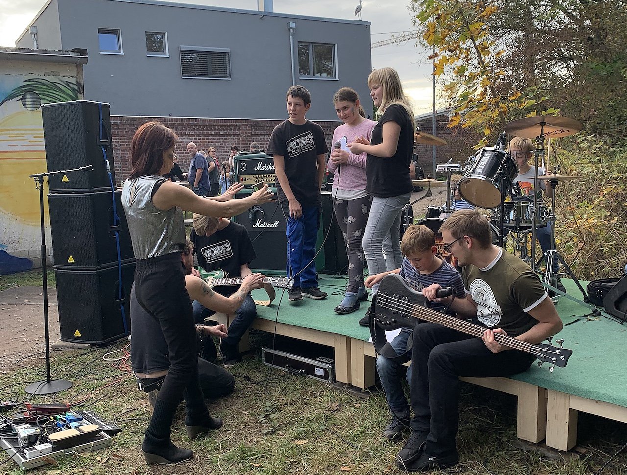 Die Jugendlichen waren interessiert an Gitarren und Schlagzeug zu Gange und die Begeisterung übertrug sich auch an die Gäste, die dem bunten Treiben vor und auf der Bühne aufmerksam folgten. Zukünftig kann man sich seitens des JUZE vorstellen, im Rahmen musikalisch-künstlerischer Arbeiten weitere Projekte in dieser Richtung zu initiieren. Diese Meinung vertrat auch Andreas Bodenlos vom Jugend- und Sozialausschuss der Stadt Ellrich, der dem Ganzen an der Seite der Bühne beiwohnte.