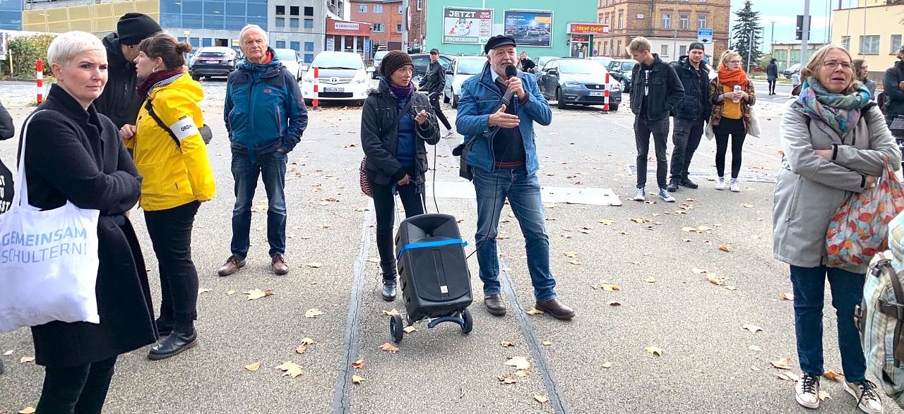 So lange die MLPD nicht auf ihre Hoheitszeichen verzichtet, wollen die anderen nicht loslaufen. Der MLPD-Sprecher rief mehrmals dazu auf, seine Anhänger in die Reihen der Demonstranten mit aufzunehmen. Wenn man heute schon die MLPD ausschließe, wer oder was solle dann morgen nicht mehr mitmachen dürfen, fragte er in die Runde. Den elektronisch verstärkten Aufrufen des MLPD-Anführers begegnete das Bündnis mit verbaler Ablehnung und lauter Musik aus einem bereitstehenden Kleinbus.