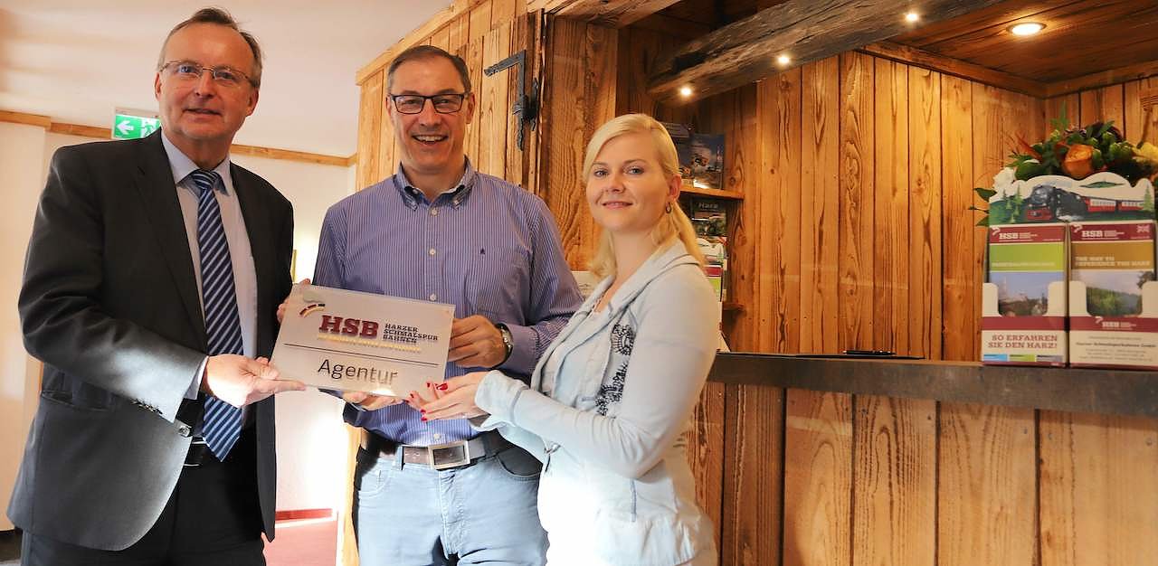Jetzt ist es offiziell: René Maksimcev, Inhaber des HarzHotel in Güntersberge, erhält die offizielle Plakette, die das Haus als HSB-Agentur ausweist von Matthias Wagener, Geschäftsführer der HSB, und Katrin Peters, Abteilungsleiterin Marketing und Vertrieb, überreicht.