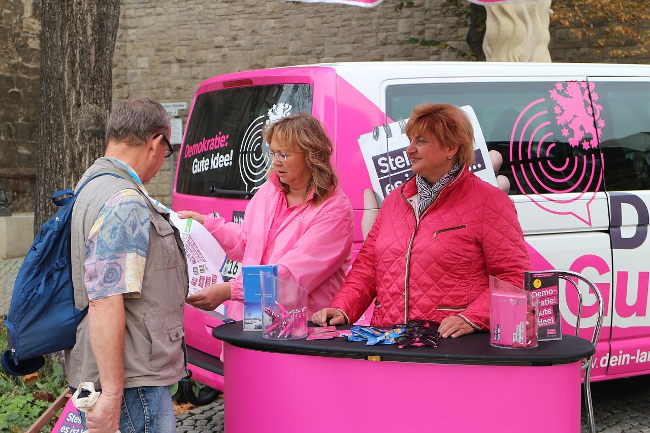 Tatsächlich steht hinter der "Demokratie-Tour" aber keine politische Partei, sondern das Organ, das sie nach der Wahl am kommenden Sonntag alle zusammenbringen soll: der Thüringer Landtag. Mit reichlich Informationsmaterial rund um die Demokratie im Freistaat reisen Frau Kaiser und ihre Kollegen seit Anfang September durch Thüringen und versuchen dem Bürger die Arbeitsweise seines Parlaments zu erklären.