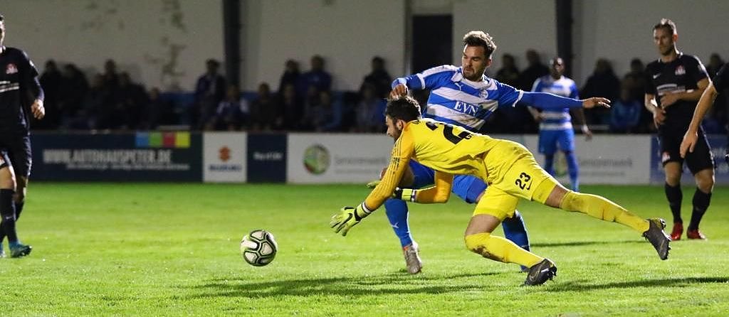 Minute 40: Langer Ball auf Mickels, der sprintet kommt aber zu knapp und kann das Leder nur noch ins Außennetz knallen