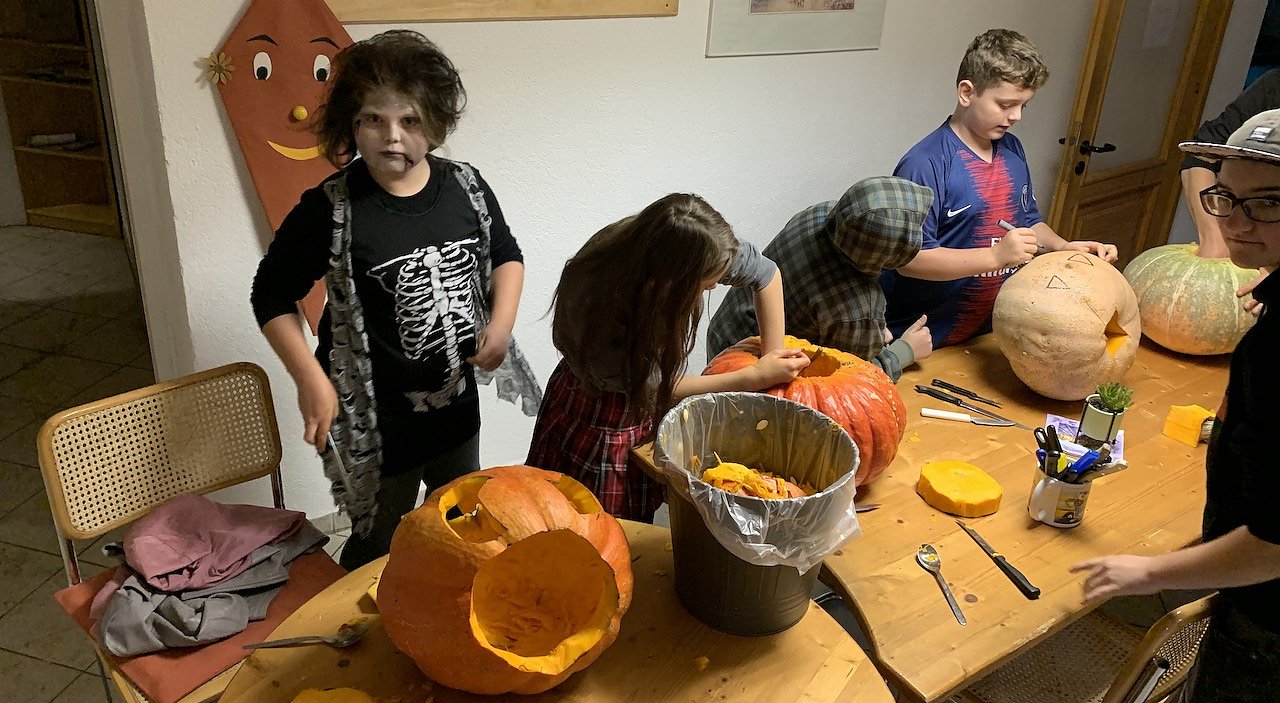 Kreativ beflügelt bastelten unsere Jugendlichen eifrig an den vorangegangenen Tagen eine gruselig schöne Dekoration und schnitzten tolle Kürbisse, die sie am Abend präsentierten.
