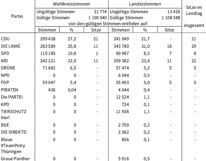 Insgesamt gaben 1 121 814 Thüringer ihre Stimme ab, was einen Prozentsatz von 64,9 entspricht. Im Umkehrschluss heißt das aber auch, dass 607 428 darauf verzichteten, irgendeine Partei zu unterstützen.