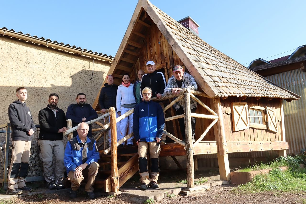Das Häuschen wurde in mehr als 8000 Arbeitsstunden von den Mitarbeitern gebaut, sagt Falk Freyberg, AWZ-Leiter im VHS Bildungswerk. Mehr als 200 Europaletten wurden zu einem 5,20 mal 3,40 Meter großen Hexenhaus mit mehr als 1400 Dachschindeln verarbeitet!