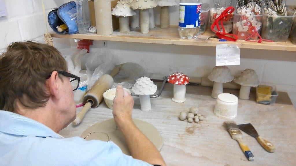 Geschickt formt Roberto Keller aus Ton für Dekorationen Pilze. Kunstvoll bemalt, sind sie von den Originalen kaum zu unterscheiden.