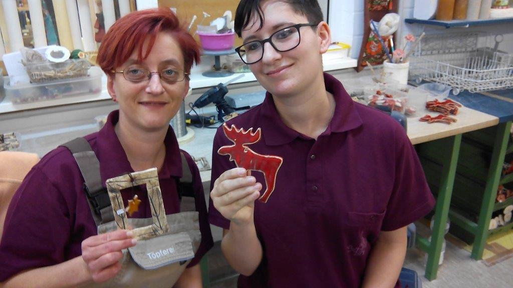 Roberto Keller hat ein ganz besonderes Händchen. Aus Ton formt er Pilze. Hübsch bemalt ähneln sie denen in Wald und Flur originell. Seit 16 Jahren ist Roberto in der Lebenshilfe tätig. Bernadett Hoffmann fertigt aus dem gleichen Material Geschenksterne, die sie auch selbst glasiert. Zehn Jahre arbeite sie hier, sagt sie. Auf Fensterrahmenbilder und Elchfiguren haben sich unter anderem Cordula Lustermann und Angelina Ewald spezialisiert. Voller Stolz halten sie ihre Arbeiten in die Kamera. Allesamt dekorative Kunstwerke.