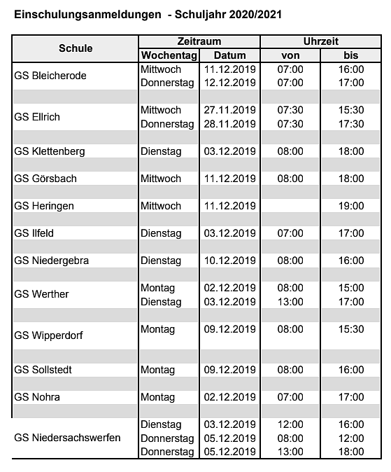 Nach dem Thüringer Schulgesetz werden alle Kinder, die bis zum 1. August des kommenden Jahres sechs Jahre alt werden, zur Einschulung angemeldet. Ein Kind, das am 30. Juni mindestens fünf Jahre alt ist, kann auf Antrag der Eltern vorzeitig eingeschult werden. Alle zukünftigen ABC-Schützen gehen vorher zur Einschulungsuntersuchung, für die sich die Eltern jedoch nicht selbst anmelden müssen. Die Einladung dafür erhalten sie vom Gesundheitsamt des Landkreises Nordhausen. Die Entscheidung, ob ein Kind eingeschult wird oder nicht, treffen nach der jeweiligen Empfehlung der Einschulungsuntersuchung die Eltern gemeinsam mit der Schule.