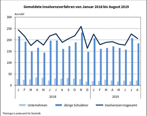 Die Thüringer Amtsgerichte entschieden von Januar bis August 2019 über 1 575 Insolvenzverfahren. Das waren nach Mitteilung des Thüringer Landesamtes für Statistik insgesamt 69 Anträge weniger als im Vorjahreszeitraum (-4,2 Prozent). Auf Unternehmen entfielen 10,1 Prozent aller Verfahren und auf übrige Schuldner (natürliche Personen als Gesellschafter u. Ä., ehemals selbständig Tätige, private Verbraucher sowie Nachlässe und Gesamtgut) 89,9 Prozent....