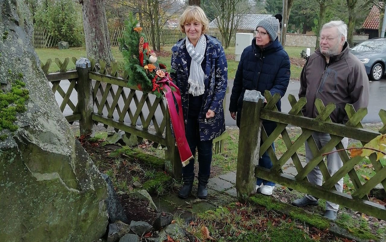 Im Beisein von Vertretern des Förderverein Sophienhof, Herrn Will als Vorsitzenden und Frau Jörgens als Mitglied, legte Petra Gerlach, Ortsteilbürgermeisterin von Ilfeld und Ratsmitglied im Gemeinderat Harztor am Gedenkstein in Sophienhof ein Gebinde ab.