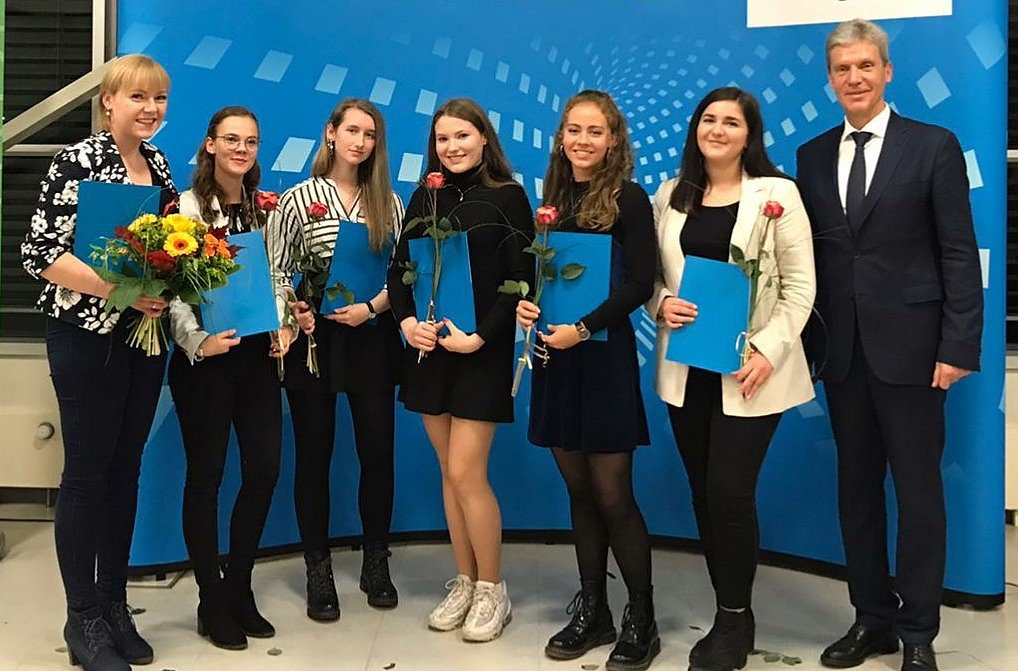 Mittlerweile lernen die Schülerinnen in der Qualifikationsphase und freuten sich über eine weitere Einladung, dieses Mal nach Erfurt. Am 11. November 2019 fand dort nun eine Auszeichnungsveranstaltung des Thüringer Ministeriums für Bildung, Jugend und Sport statt. Feierlich umrahmt richtete Bildungsminister Helmut Holter persönlich das Wort an alle Preisträger und lobte das Engagement zahlreicher Lernender in den Bereichen Sport, Naturwissenschaften, Fremdsprachen, Gesundheit und Demokratieerziehung. Holter hob das hohe Leistungsvermögen sowie den unter Beweis gestellten Teamgeist hervor. Er sei stolz auf die Lernkultur an Thüringer Schulen, so der Minister.