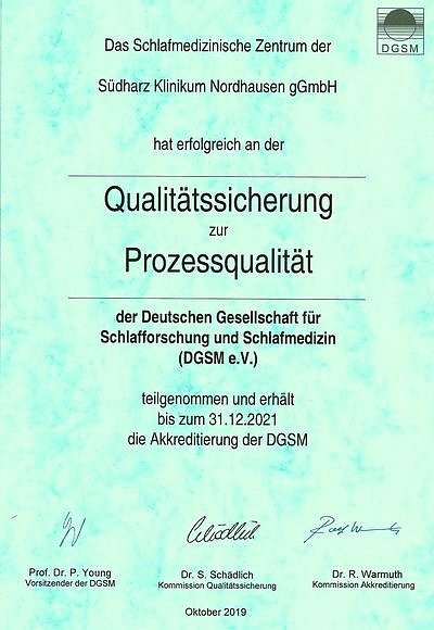 Die Prüfer der Deutschen Gesellschaft für Schlafmedizin attestierten damit den Mitarbeitern des Nordhäuser Schlaflabors unter Leitung von Oberärztin Dr. Antje Haas erneut eine gute, standardisierte Rundumversorgung der ihnen anvertrauten Patienten. Hierzu gehören im Zusammenspiel der medizinischen Fächer neben dem eigentlichen Schlaflabor die Kliniken für Thoraxchirurgie und Pneumologie, die HNO-Abteilung und die Zahnmedizin des Klinikums.