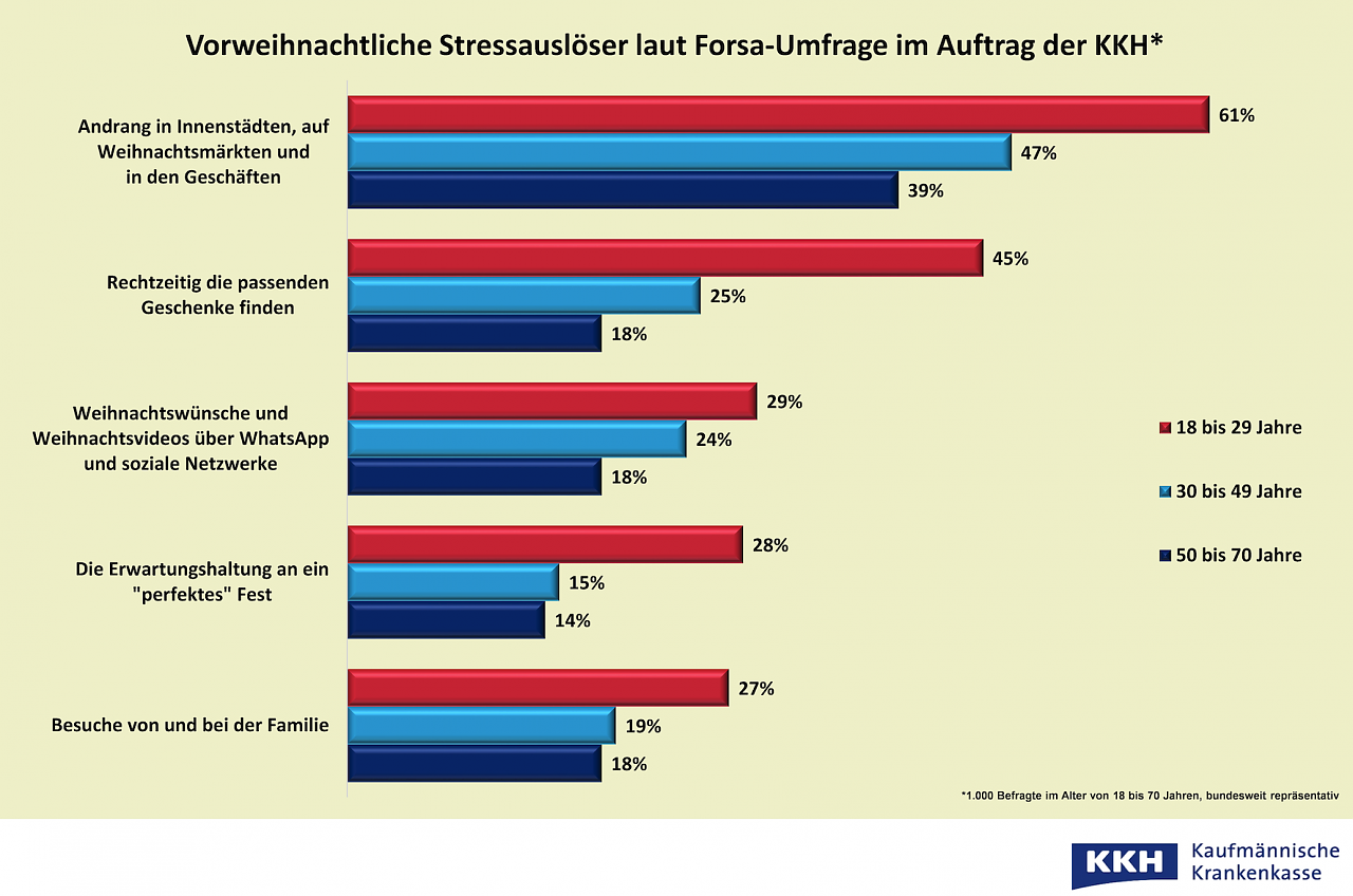 Besinnlich und gemütlich? Von wegen! In der Vorweihnachtszeit steigt vor allem bei jüngeren Menschen der Stresspegel. Stimmungskiller Nummer eins ist der Andrang in Innenstädten, auf Weihnachtsmärkten und in den Geschäften. Das hat eine Umfrage im Auftrag der Krankenkasse KKH ergeben...