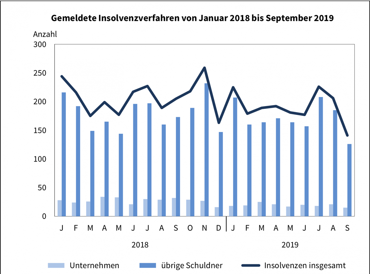 Die Anzahl der Unternehmensinsolvenzen ging in den ersten neun Monaten 2019 gegenüber 2018 um 83 Verfahren bzw. 32,3 Prozent auf 174 Unternehmen zurück. Diese insolventen Unternehmen beschäftigten zum Zeitpunkt des Antrages noch 2 670 Arbeitnehmer.