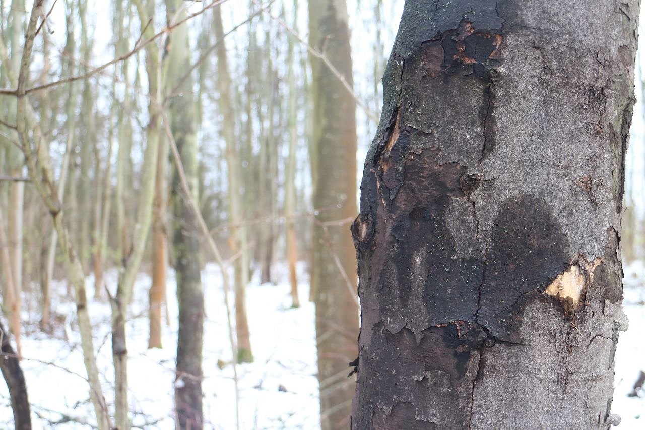 In dem kleinen Waldstück rechts neben dem Warttürmchen in Richtung Klinikum hat der "Rußrindenpilz" ein gutes dutzend Ahornbäume befallen. Der Parasit ist nicht ganz ungefährlich, sowohl für die Bäume wie auch für den Menschen. Die Sporen des Pilzes können zu Entzündungen der Lungenbläschen und damit zu massiven Reizungen der Atemwege, Fieber und Atemnot führen, Allergiker können besonders betroffen sein. Am Baum überzieht der Pilz die Rinde mit einem schwarzen Film, einer Rußspur nicht unähnlich, daher auch der Name. Bei schwerem Befall bricht die Rinde früher oder später auf, blättert ab und der Baum stirbt.