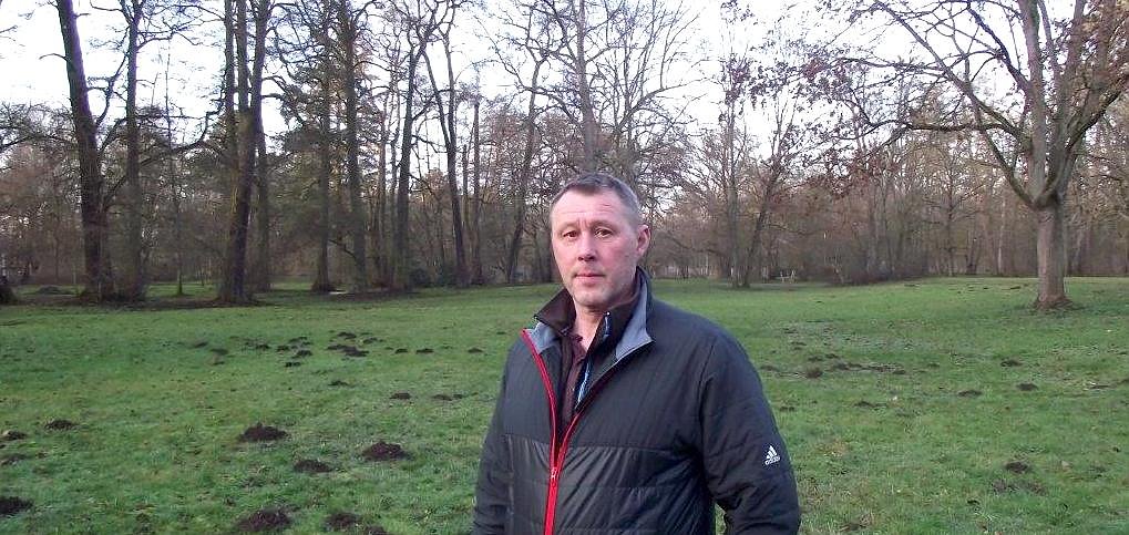 Stadtförster Axel Axt im Stadtpark. Unter den großen Bäumen im Hintergrund befindet sich rechts im Bild eine stattliche Blutbuche. Sie trieb im Frühjahr Blätter aus, die leider im Sommer wieder eintrockneten. Das Frühjahr wird zeigen, ob der Baum und viele andere noch zu retten sind.
