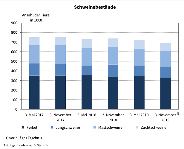 Zur Vorjahreserhebung am 3. November 2018 wurden in Thüringen 738 000 Schweine ermittelt. Somit erfolgte innerhalb eines Jahres ein Bestandsabbau um 46 900 Tiere. Nach Schweinekategorien wurden zum 3. November dieses Jahres 24 600 Ferkel und Jungschweine, 16 500 Mastschweine und 5 800 Zuchtschweine weniger als vor einem Jahr festgestellt.