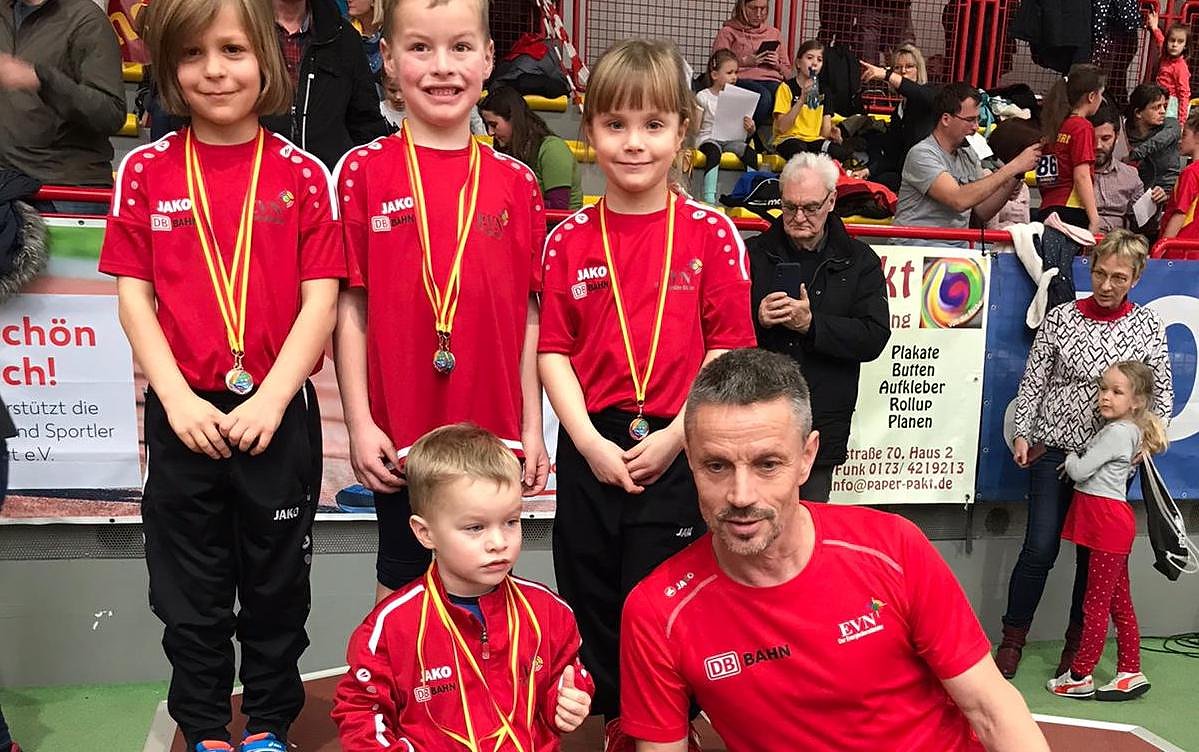 Neben ca.500 Sportlern und ihren Trainern waren auch Familien und Freunde zum anfeuern vor Ort. Die Atmosphäre war wie bei den Großen, dem entsprechend war auch die Anspannung. Publikumslieblinge waren die vierjährigen Sportler die 30m sprinteten, weit sprangen und eine 200m Hallenrunde absolvierten. Unser Starter Albert Schönemann errang drei Medaillen, darunter den 1. Platz im Weitsprung mit 1,61m. Sein Bruder Arthur konnte in der AK 7 ebenfalls dreimal auf das Siegerpodest klettern. Beim Sprint (9,52 s) und im Weitsprung (2,60 m)den Sieg knapp verpasst, gewann er über 200m in 40,60s.