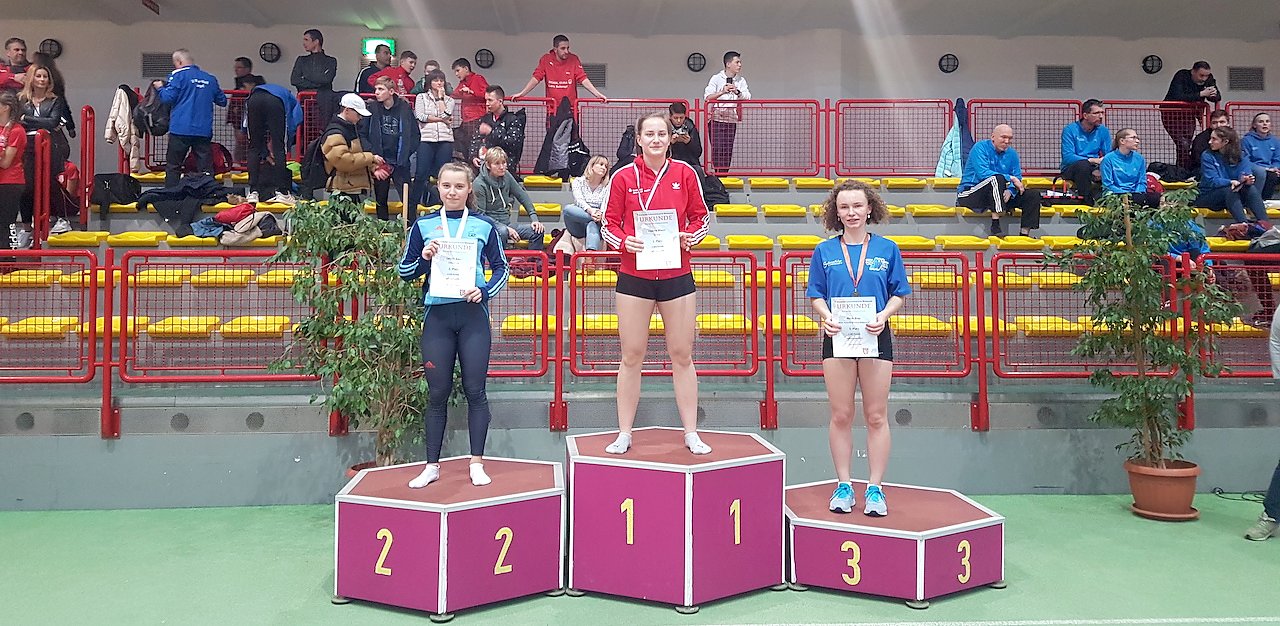 Dieses gelang Chantal Rimke (W15) gleich 3mal. Noch im Vorjahr in schwarz-gelb für LV Altstadt startend, trägt sie nun die Farben des LC Jena. Sie entschied sich im Sommer für einen Wechsel auf das Jenaer Sportgymnasium. Im Hochsprung und im 800 m Lauf hat sie ihre Bestleistungen nahezu bestätigt. Die 60 m Hürden in 9,98 s, der Weitsprung mit 4,85 m und das Kugelstoßen, die Paradedisziplin, mit starken 13,99 m, hat Chantal neue PBL erzielt. Dies bedeutete eine Verbesserung von fast 300 Punkten in der Gesamtwertung, Platz 1 und die Goldmedaille.