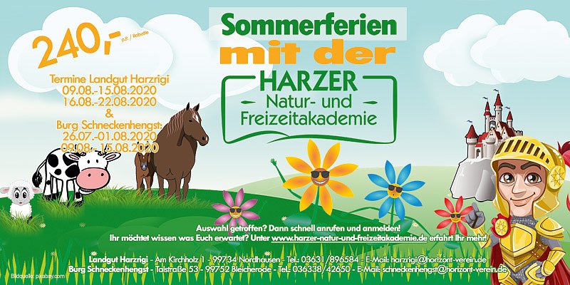 Die Harzer Natur- und Freizeitakademie des Horizont-Vereins mit ihren beiden Häusern Burg Schneckenhengst in Bleicherode und Landgut Harzrigi in Nordhausen bietet wieder ihre Feriencamps an.
