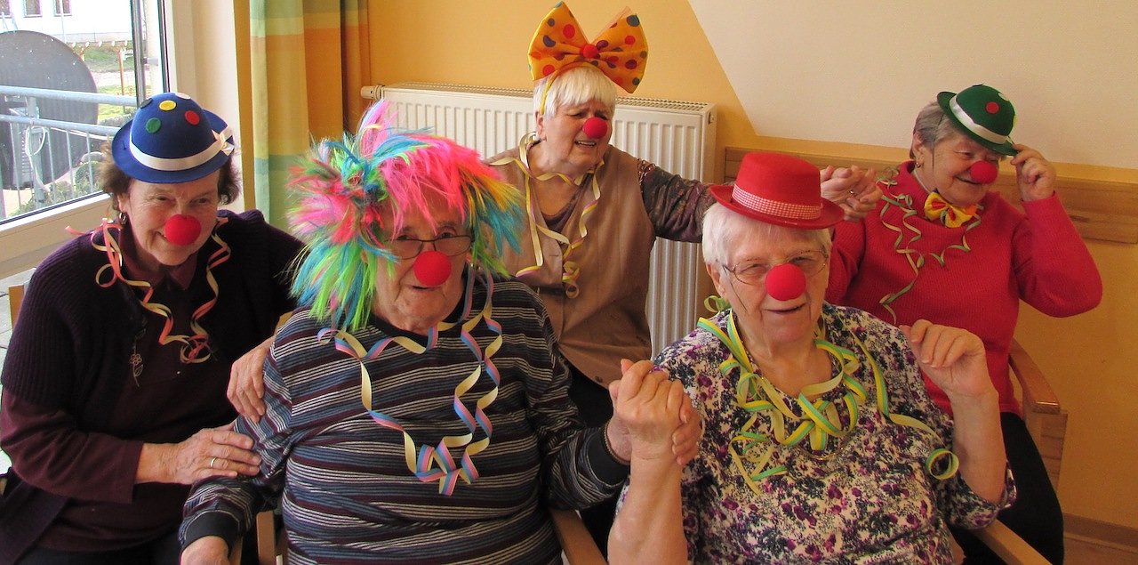 Bunt war nicht nur die Dekoration, sondern auch die hübschen Kostüme aller Beteiligten. Mancher Bewohner/in wählte ein Clown Kostüm und schickte viele süße Küsse durch die Luft. Rhythmische Musik lockte einige Senioren/innen auf die Tanzfläche.