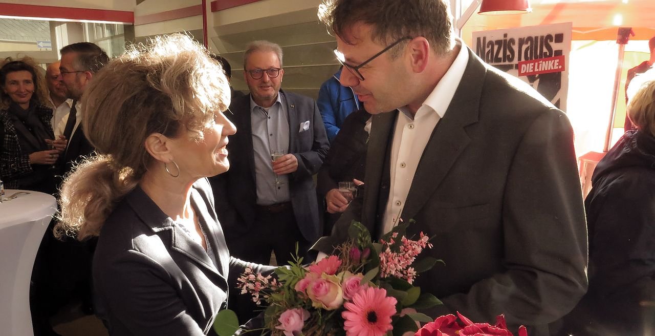 Bürgermeister Frank Rostek gratuliert zur BüroeröffnungMan stelle sich vor und schreibe das Jahr 1990, die gerade umbenannte SED hätte an der Bleicheröder Hauptstraße ein Büro eröffnet. Vermutlich wären einige standhafte Genossinnen und Genossen die einzigen Gäste gewesen und vermutlich hätten vor der Tür die CDU, das Neue Forum und der Demokratische Aufbruch dagegen demonstriert.