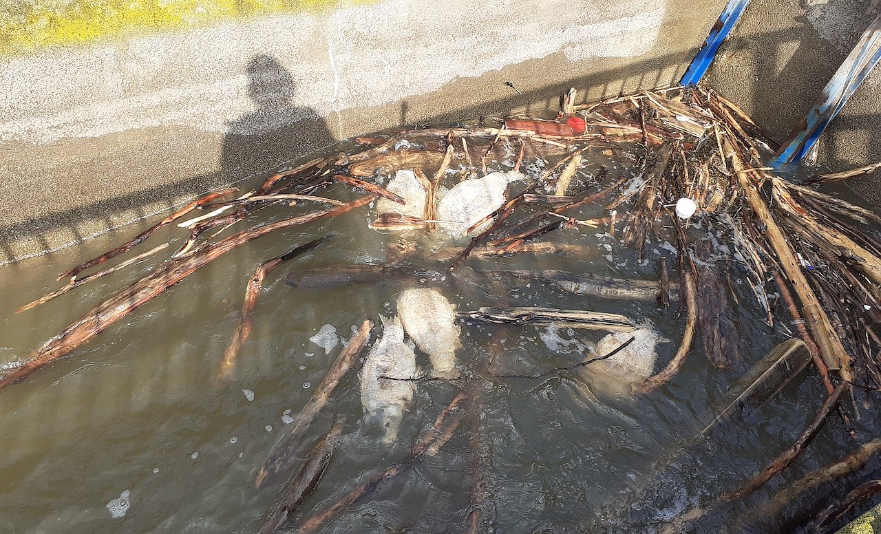 Fünf verendete und teilweise verwesende Karpfen von etwa 50 – 60 cm Länge am Bauwerk 1 in der Talsperre Kelbra