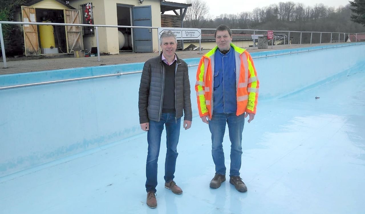 Bürgermeister Andreas Gerbothe bei der Besprechung im Freibad mit dem verantwortlichen Bauhofmitarbeiter Axel MüllerIn jedem Jahr gibt es immer viele Dinge zu erledigen, ehe der erste Badegast kommt. So sind derzeit die Mitarbeiter des Bauhofes dabei, eine über 50 Jahre alte Wasserleitung zu erneuern und im Zuge dessen zwei neue Duschen entlang des großen Beckens neu zu installieren.
