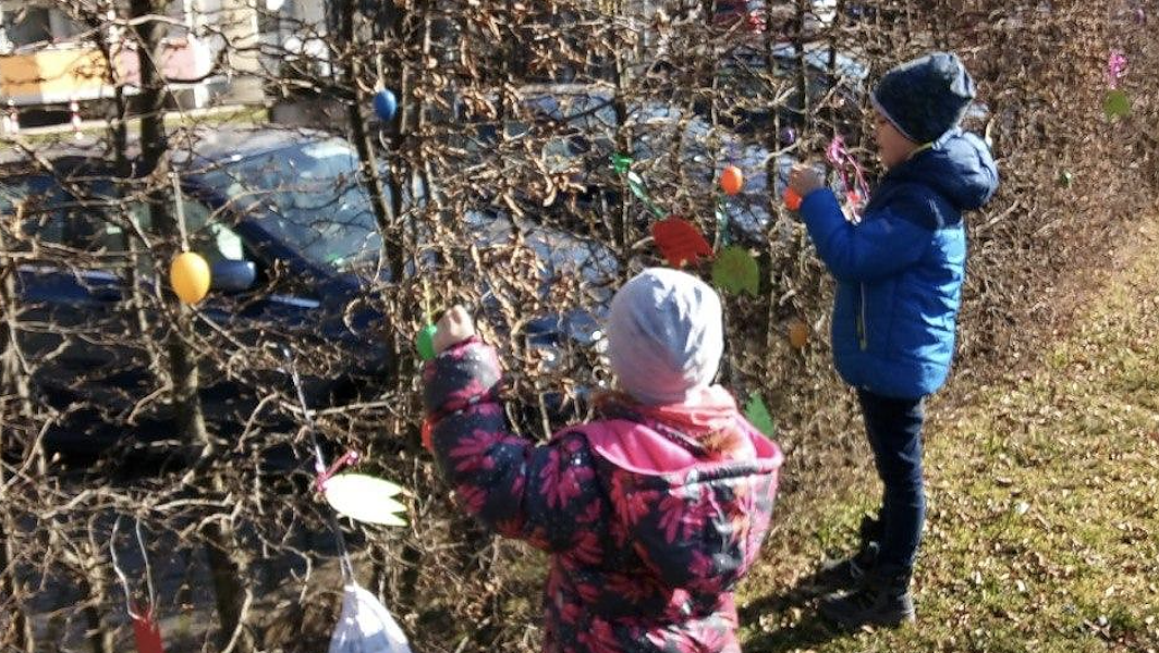 Ein wenig Normalität in so schwierigen Zeiten hat Peter Blei gestern im Herzen der Stadt entdeckt - am Kindergarten "Tierhäuschen" wird Osterdekoration angebracht...