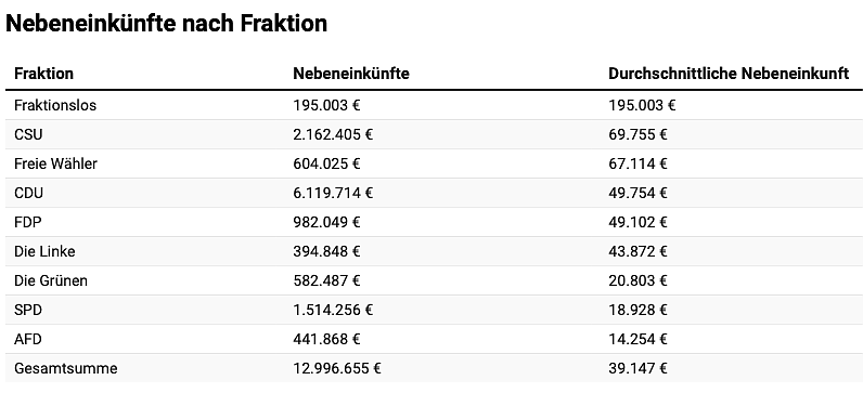 Insgesamt verdienen die CDU-Politiker mit 6,1 Millionen Euro mit Abstand am meisten. Pro Abgeordneten mit Nebeneinkünfte belegt die Christlich Demokratische Union allerdings nur den dritten Platz: Die CSU-Abgeordneten landen diesbezüglich mit jährlichen Nebeneinkünften in Höhe von durchschnittlich 69.755 Euro auf dem ersten Platz, dicht gefolgt von den Freien Wählern (67.114 Euro). Die CDU-Politiker verdienen im Schnitt 49.754 Euro – Platz drei. Der einzige fraktionslose Politiker mit gemeldeten Nebeneinkünften, der bayerische Abgeordnete Markus Plenk, verdiente zuletzt 195.003 Euro.