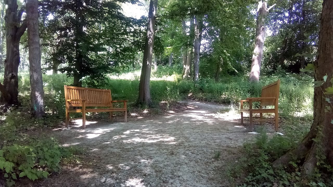 Auf Bänken unter schattigen Bäumen lässt es sich angenehm verweilen, die Natur genießen. Diese im Bild sponserte die Kreissparkasse. (Foto: Kurt Frank)
