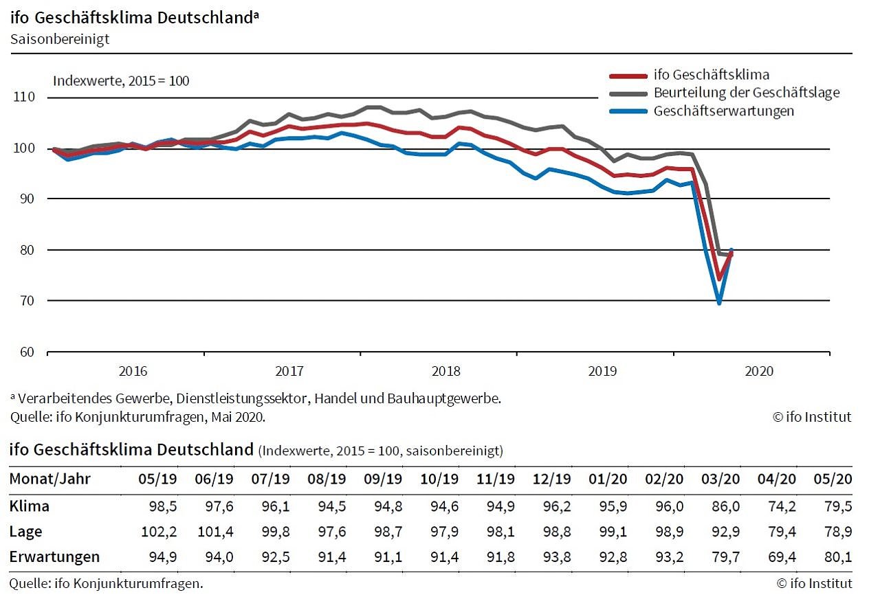 Die Stimmung unter den deutschen Unternehmen hat sich nach den katastrophalen Vormonaten etwas erholt. Der ifo Geschäftsklimaindex ist im Mai auf 79,5 Punkte gestiegen, nach 74,2 Punkten im April...