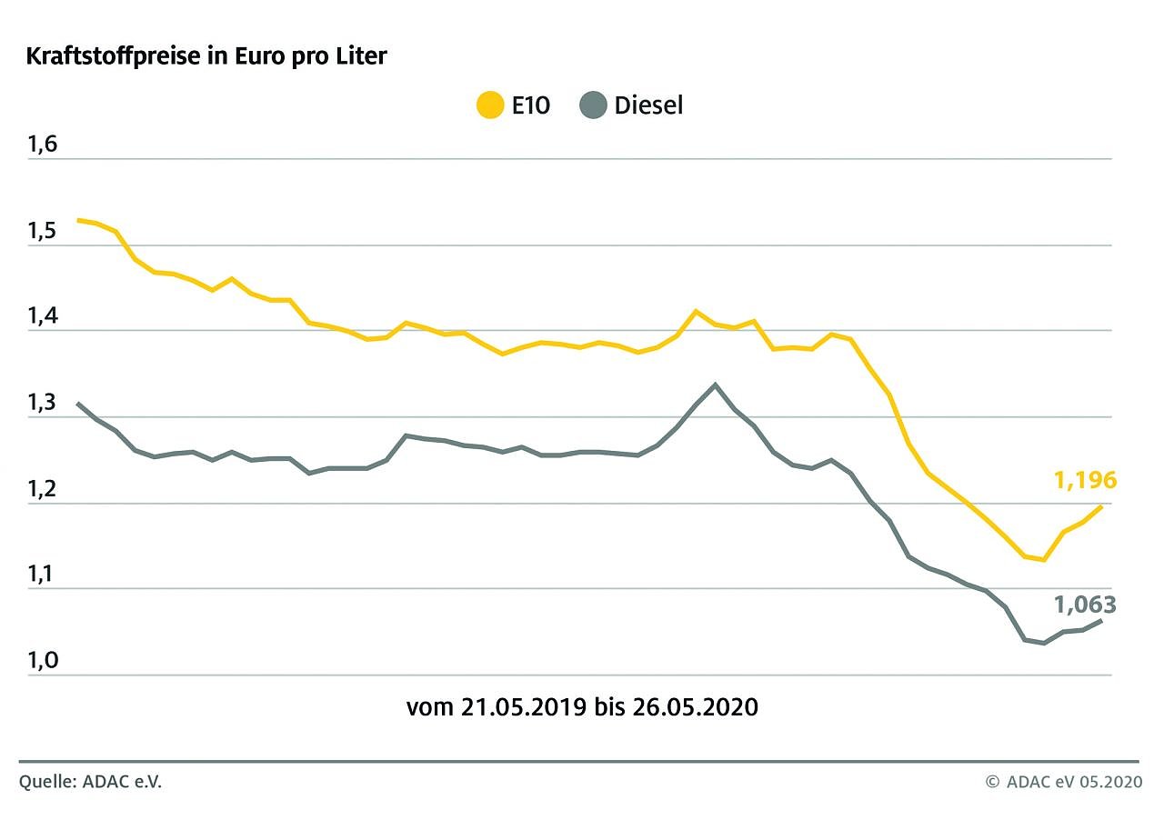 Diesel verteuerte sich um 1,1 Cent auf durchschnittlich 1,063 Euro je Liter. Das ist bereits der dritte Wochenanstieg in Folge. Im Vergleich zu den Preisen vor der Coronakrise ist Tanken im Bundesschnitt dennoch rund 10 Cent je Liter billiger.