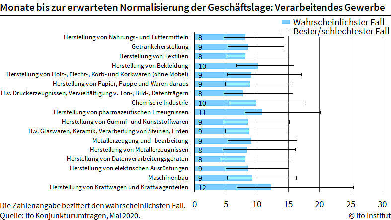 In den meisten Wirtschaftszweigen gaben die Unternehmen in der ifo-Umfrage an, dass eine Normalisierung ihrer Geschäftslage in acht oder neun Monaten am wahrscheinlichsten sei. Am längsten dauern dürfte das Hochfahren in der Luftfahrt mit 16 Monaten. Aber auch Reisebüros und Reiseveranstalter, Unternehmen in der Beherbergungs- und Gastronomiebranche sowie die Automobilindustrie gehen von einer überdurchschnittlich langen Erholung aus. Neben der wahrscheinlichsten Dauer der Normalisierung machten die Unternehmen auch Angaben über die von ihnen erwartete Spannbreite. Demnach könnte sich die Dauer der Normalisierung im besten Fall auf durchschnittlich fünf Monate verkürzen, im schlechtesten Fall aber deutlich auf durchschnittlich 16 Monate steigen.