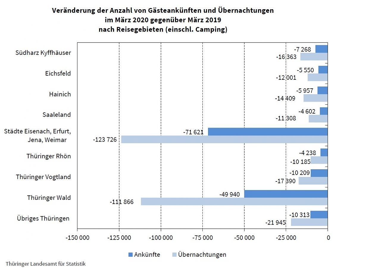 Alle neun Thüringer Reisegebiete verzeichneten im März 2020 sowohl bei Gästeankünften als auch bei Übernachtungen drastische Verluste. Bezüglich der Übernachtungen reichte die Spanne von -30,2 Prozent im Reisegebiet Thüringer Rhön bis -66,5 Prozent im Reisegebiet der Städte Eisenach, Erfurt, Jena und Weimar.