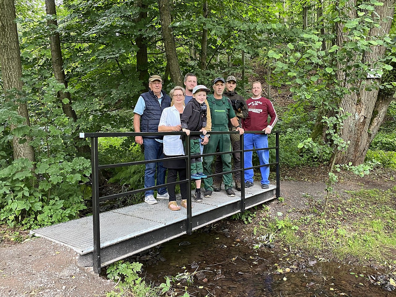 Zuerst mussten wir den Unterbau reparieren, nach über 20 Jahren war er stark verwittert, erläuterte gestern Ronald Heber bei der Einweihung. Da der Holzboden bei Regen und Schnee zu rutschig war, wurden Gitterroste verbaut. Ein neues Geländer sorgt für mehr Sicherheit über den kleinen Bach. Wir freuen uns sehr über diese Unterstützung, sagte Christel Meyer, Vorsitzende des Harzklub Zweigvereins Neustadt/ Osterode, und dankt den Naturfreunden und Jägern für ihren Einsatz. Zum Verweilen lädt jetzt auch eine Bank an der Brücke ein.