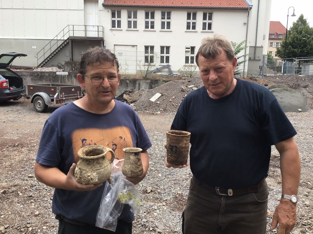 Archäologe Andreas Egold (links) und sein Kollege Peter Franke mit einigen der gut erhaltenen Keramikfunde aus dem mutmaßlichen "Töpferbrunnen" (Foto: A. Müller)